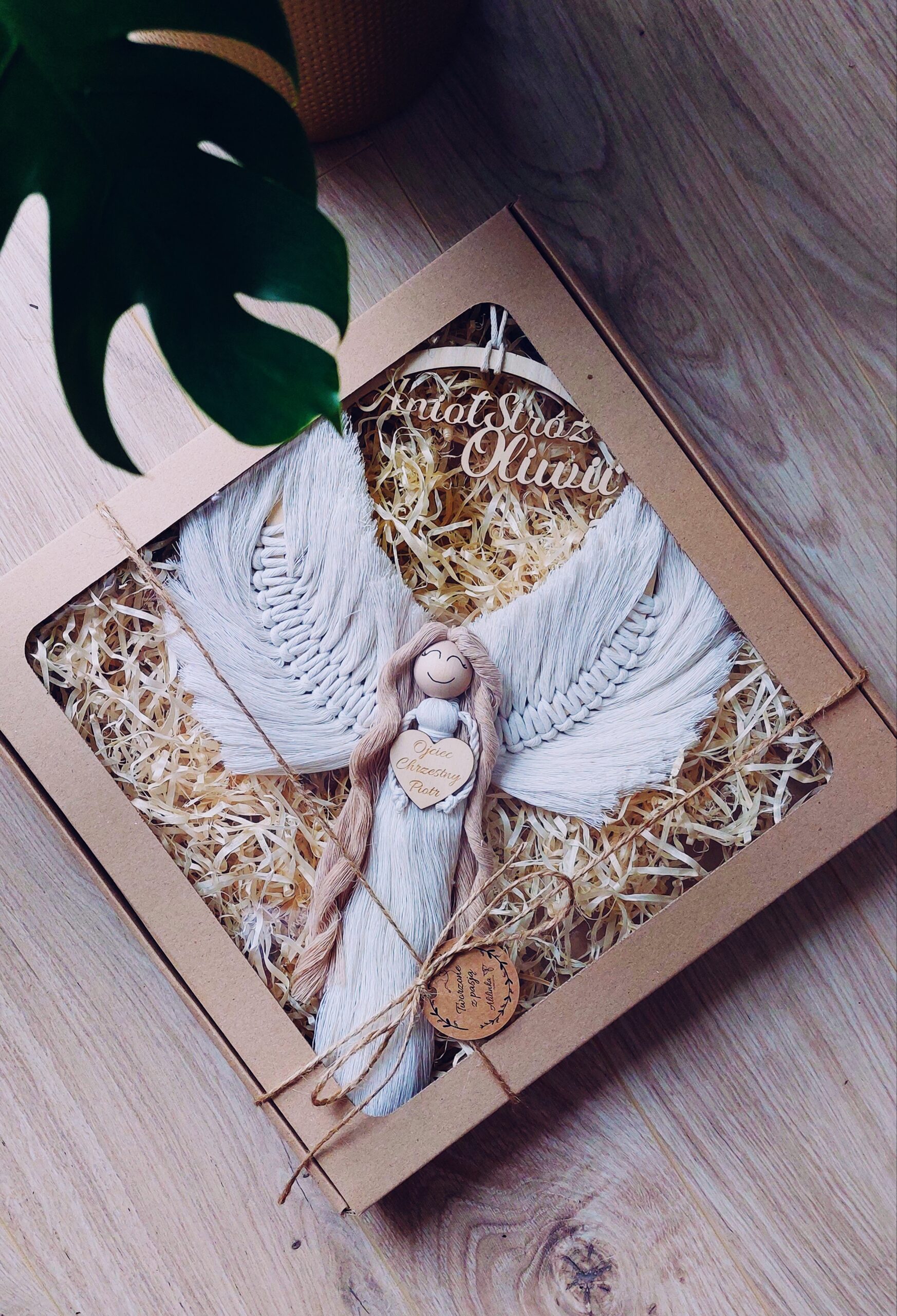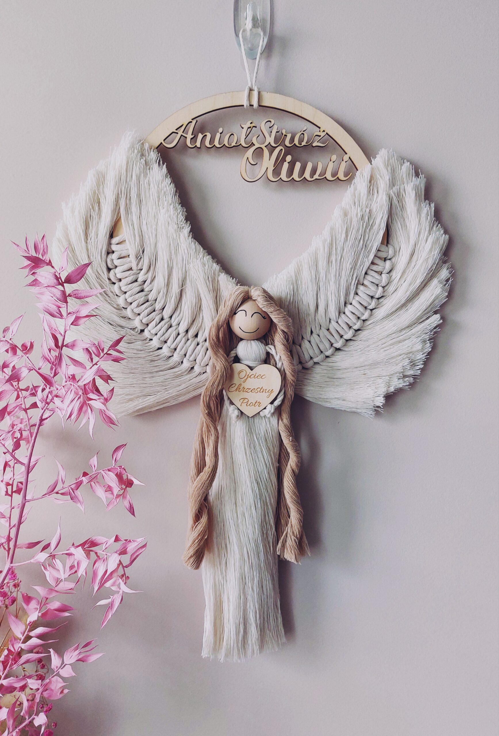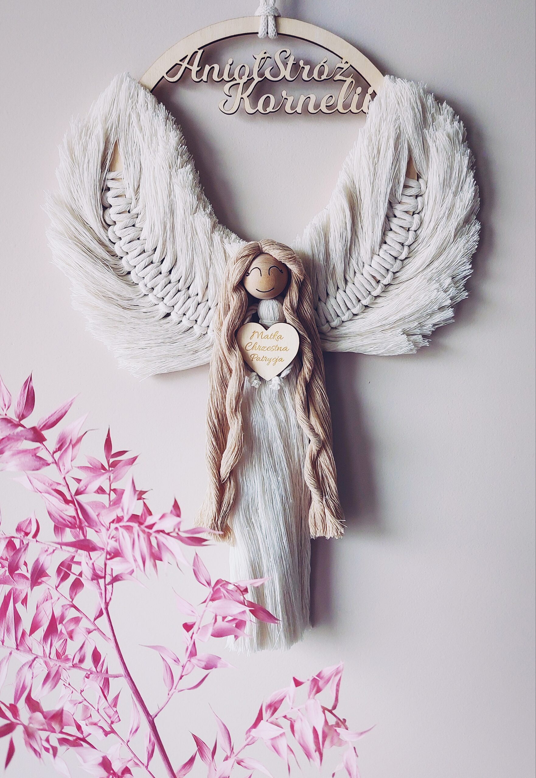 Anioł Stróż wykonany ze sznurka, metodą makramy.