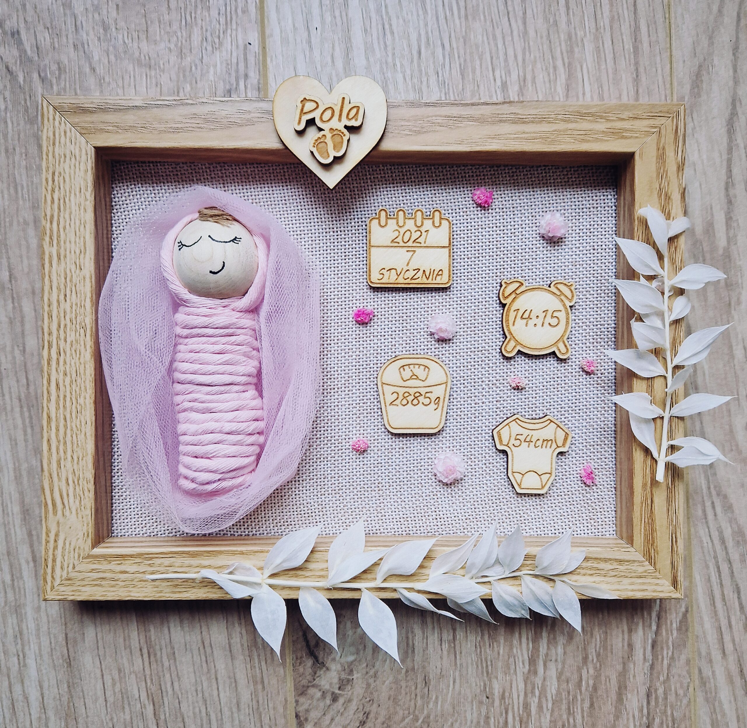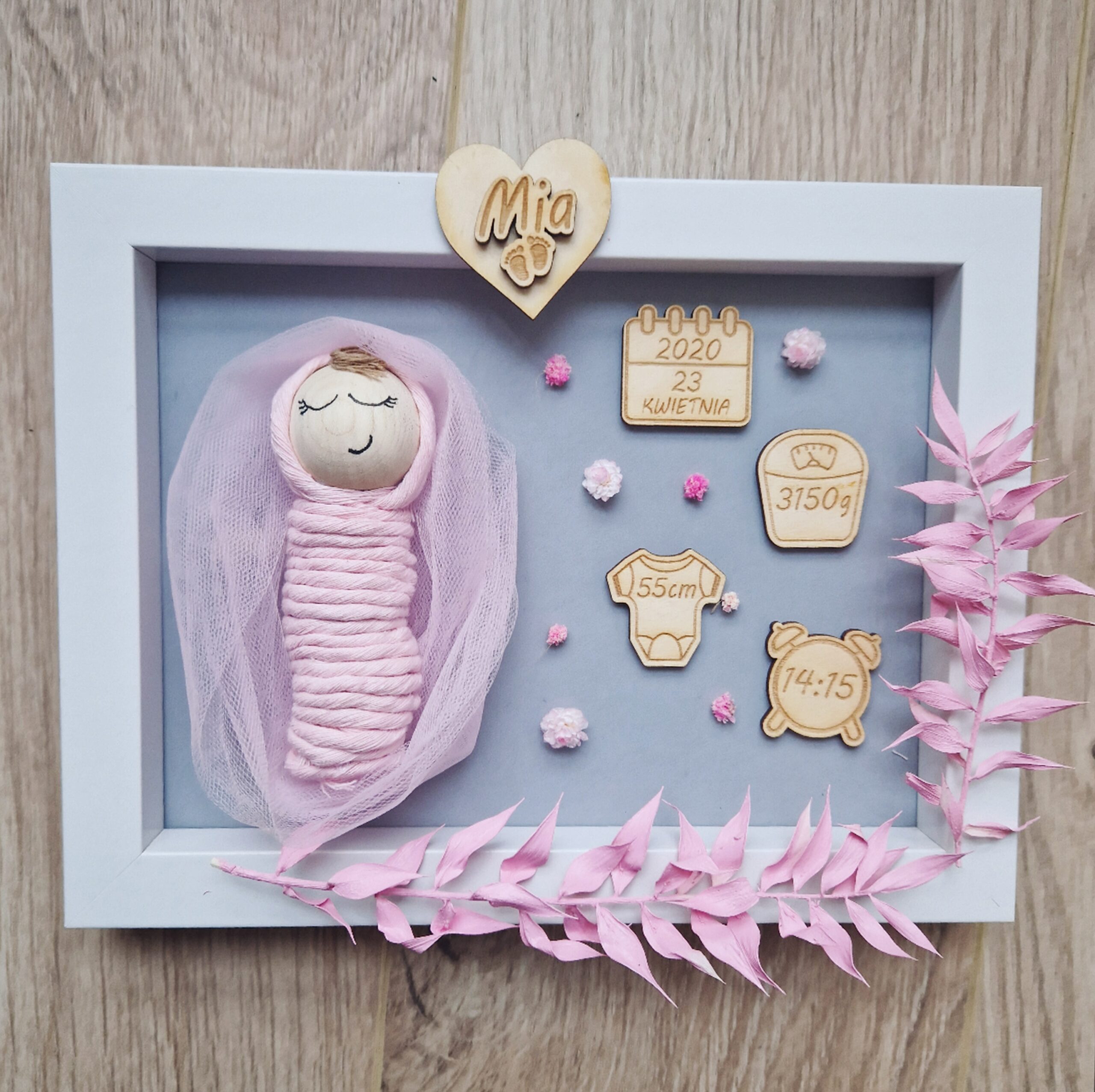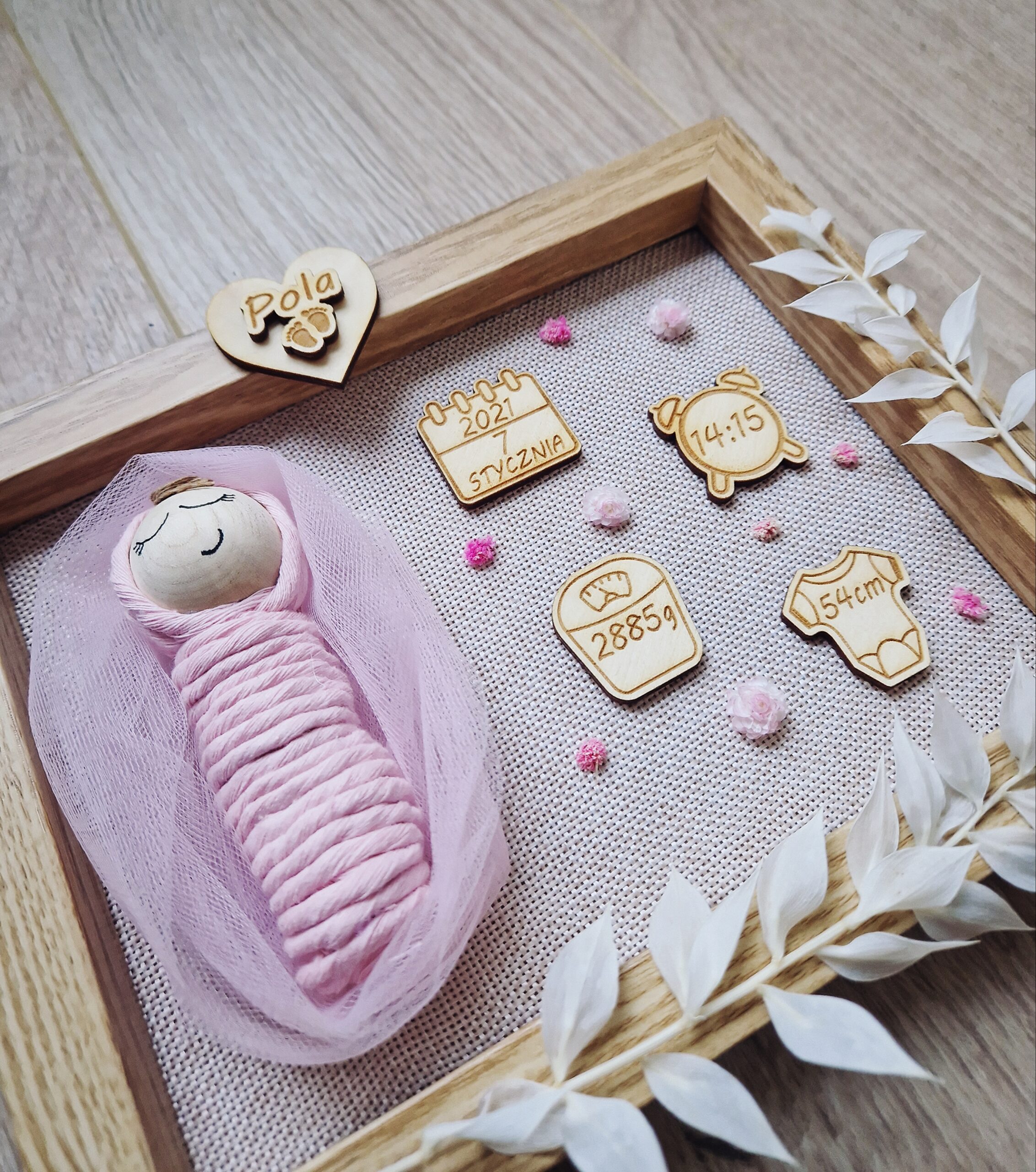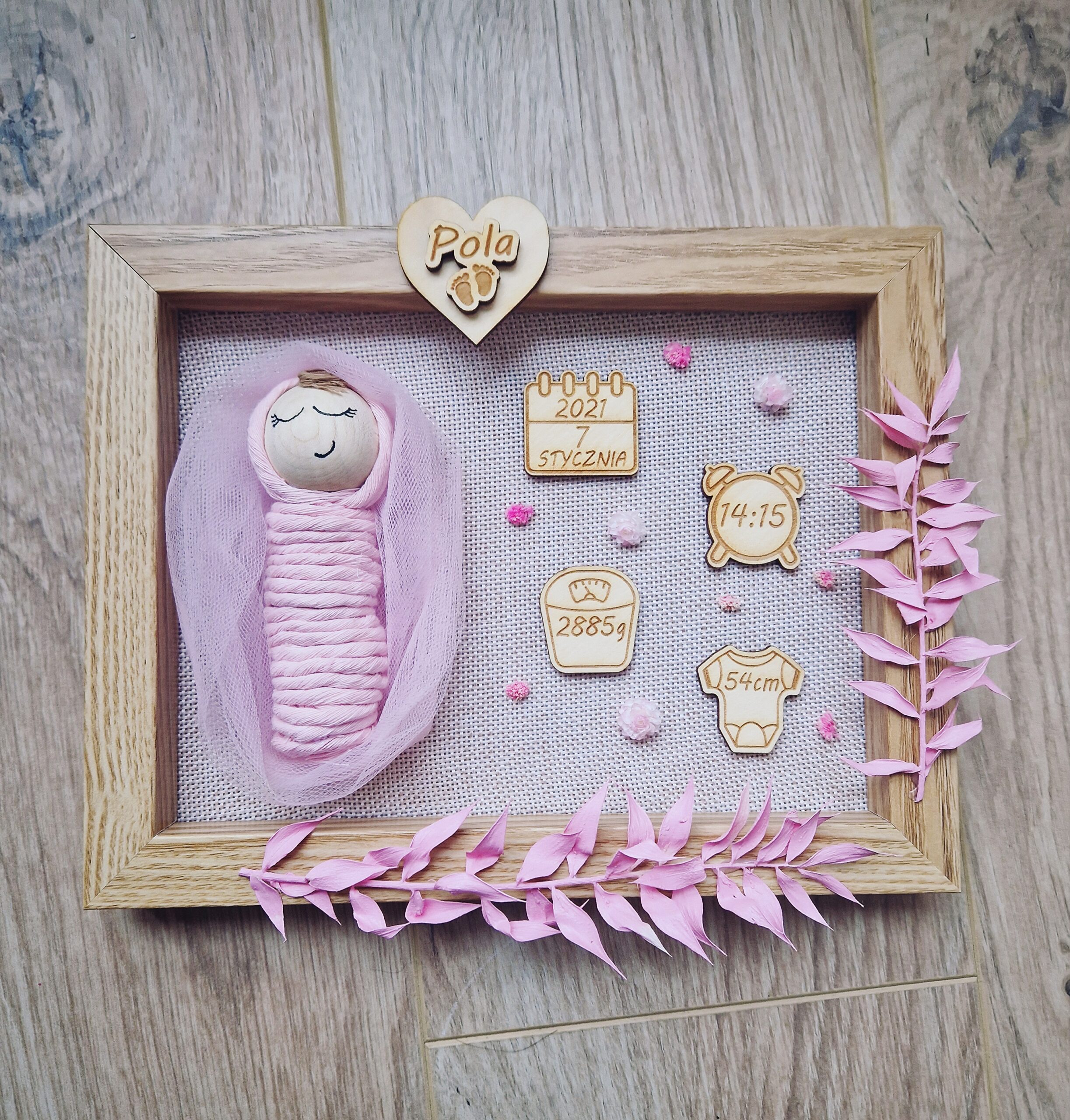 W opisie zamówienia należy podać: kolor ramki: biały lub drewniany, kolor tiulu i suszków: różowy, niebieski lub kremowy (można wymieszać dwa kolory), imię dziecka, data urodzenia, godzina, waga oraz długość.