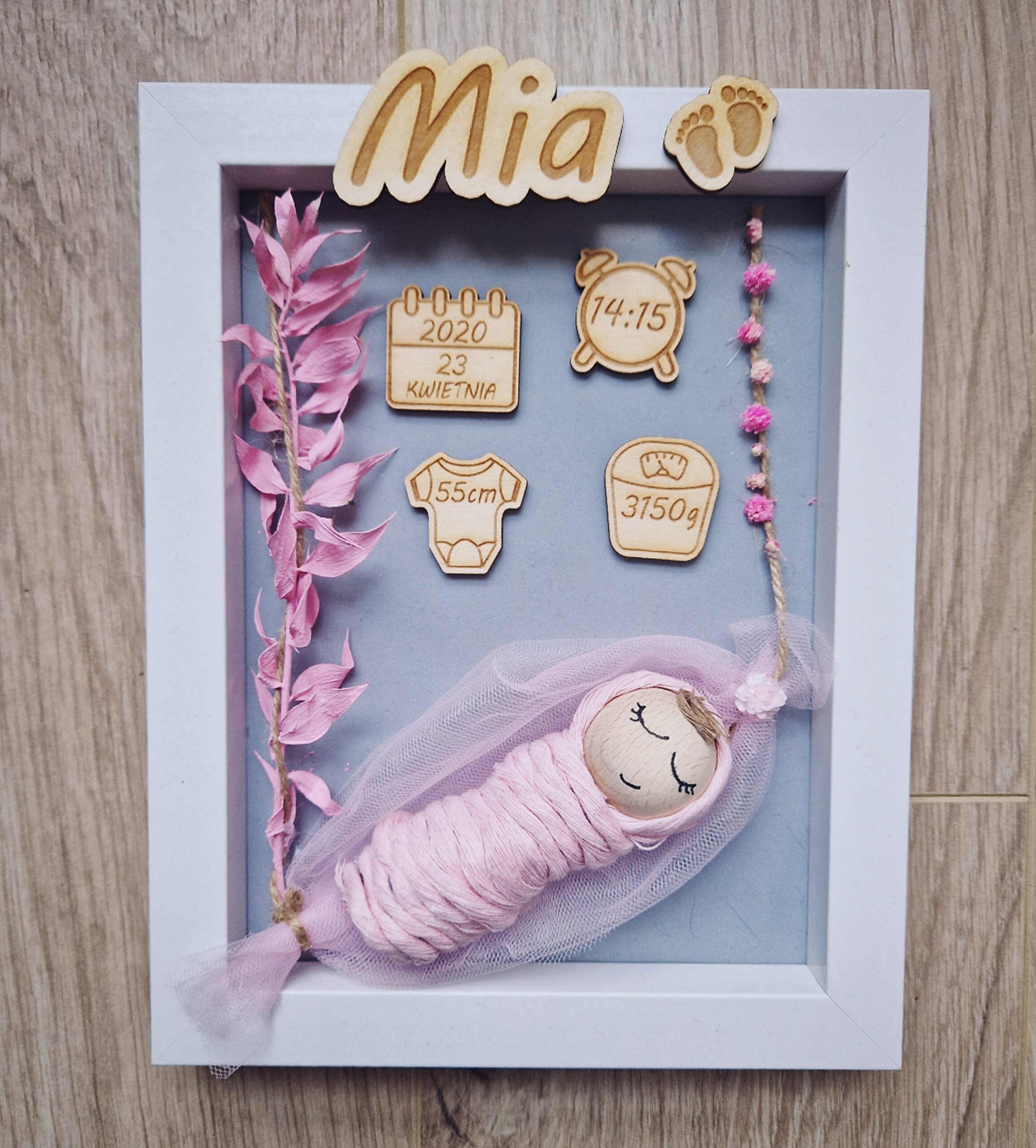 W opisie zamówienia należy podać: kolor ramki: biały lub drewniany, kolor tiulu i suszków: różowy, niebieski lub kremowy (można wymieszać dwa kolory), imię dziecka, data urodzenia, godzina, waga oraz długość.