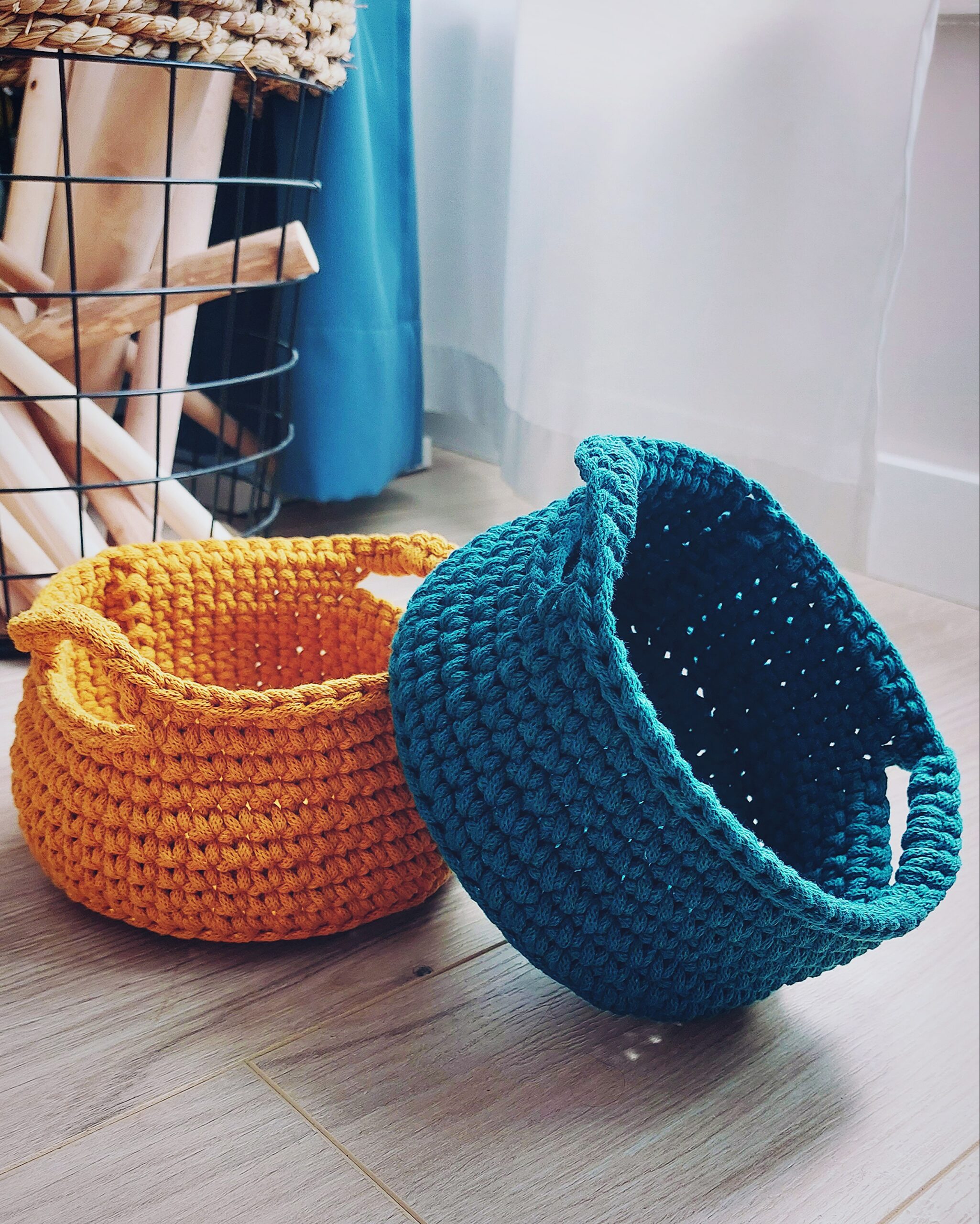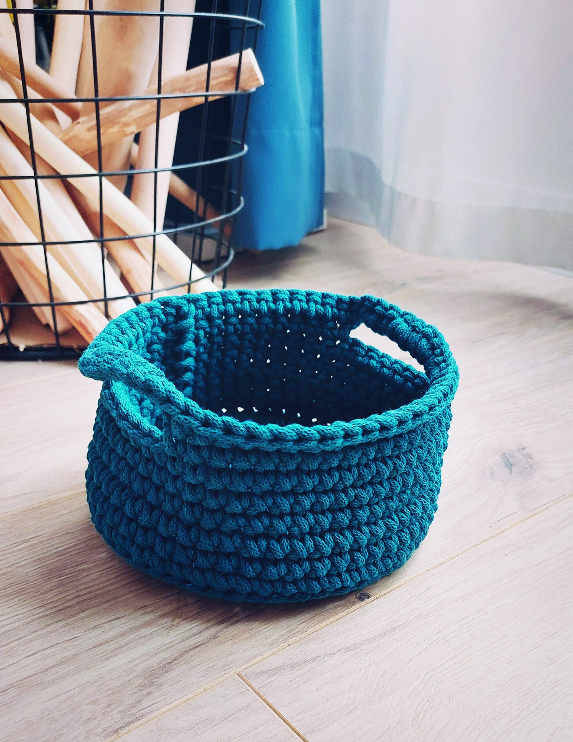Koszyczek wykonany na szydełku. Jego średnica to 16 cm, a wysokość to 9 cm.