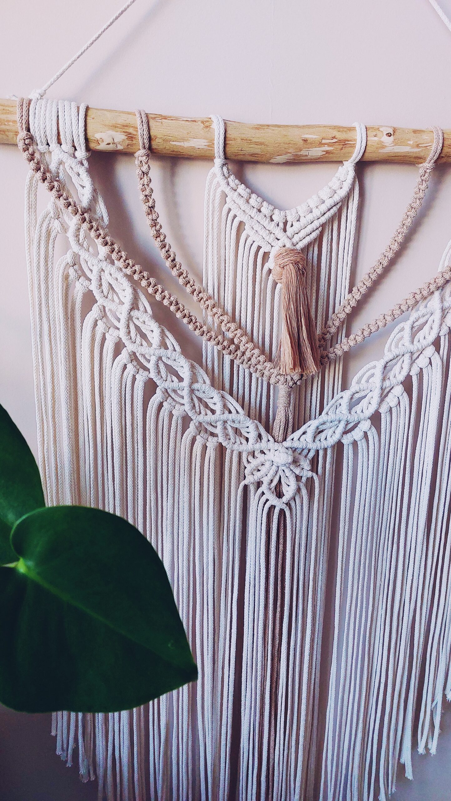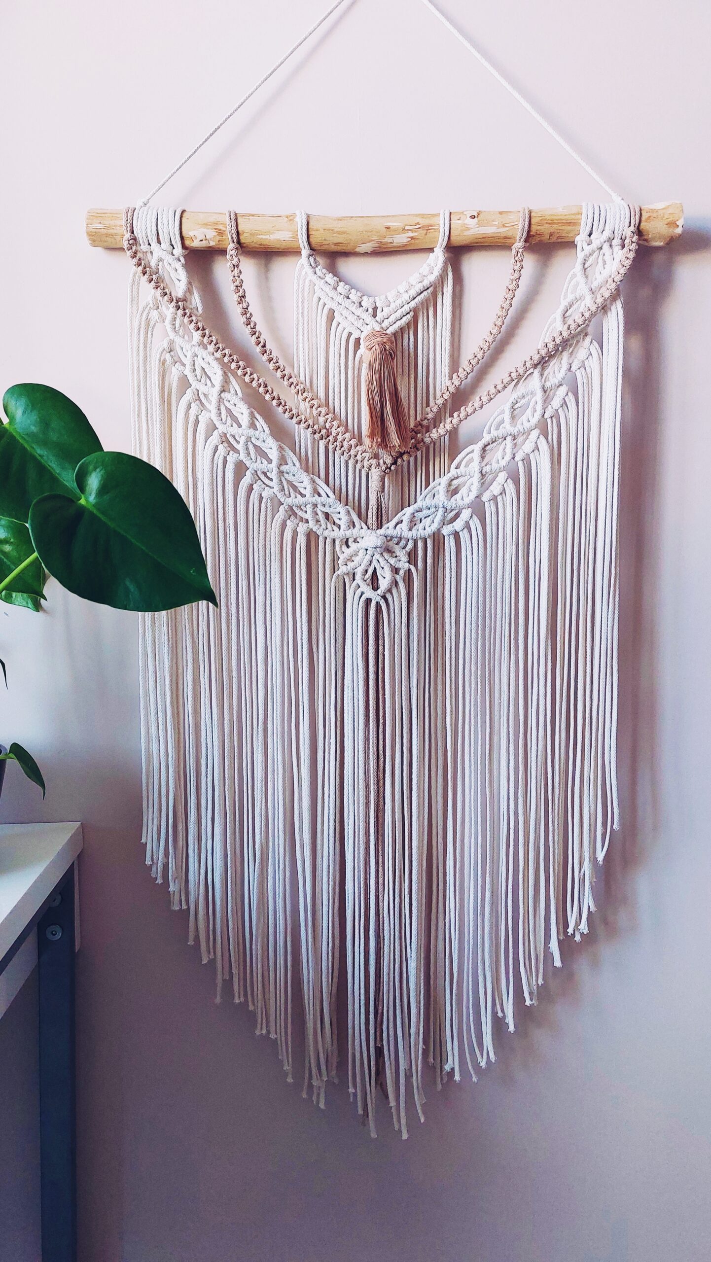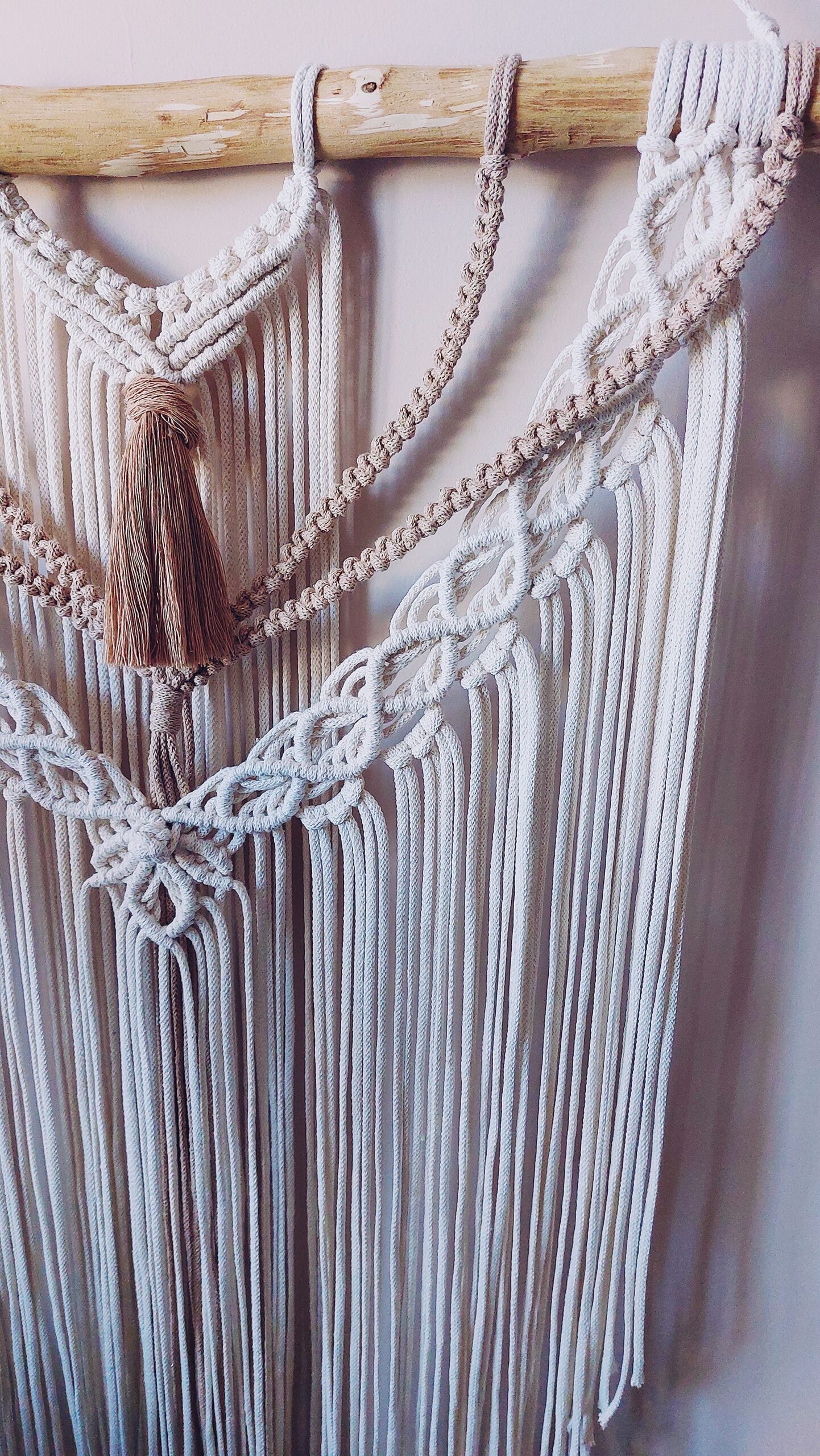 Makrama na kiju 50 cm, o długości całkowitej około 85 cm + zawieszka.