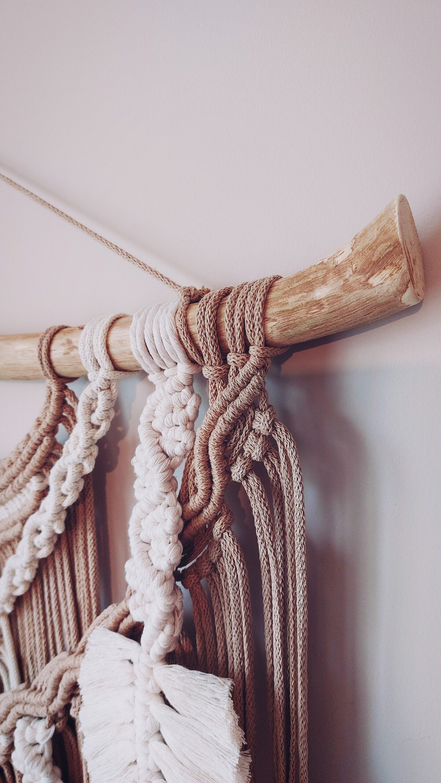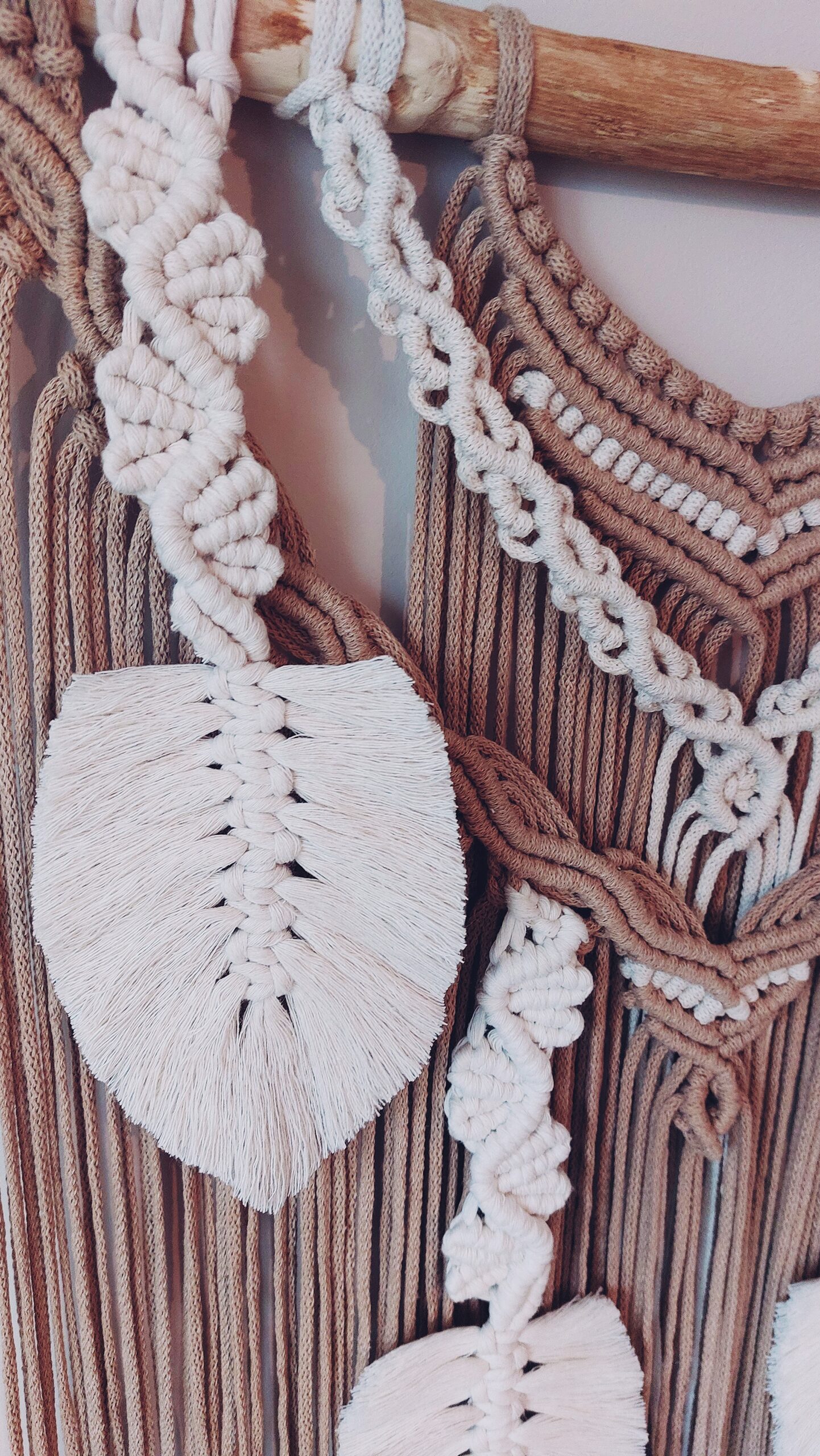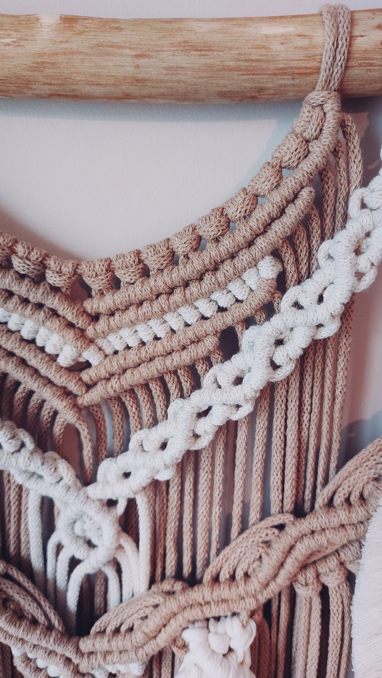 Makrama na kiju o długości 50 cm. Jej długość to 85 cm + zawieszka.