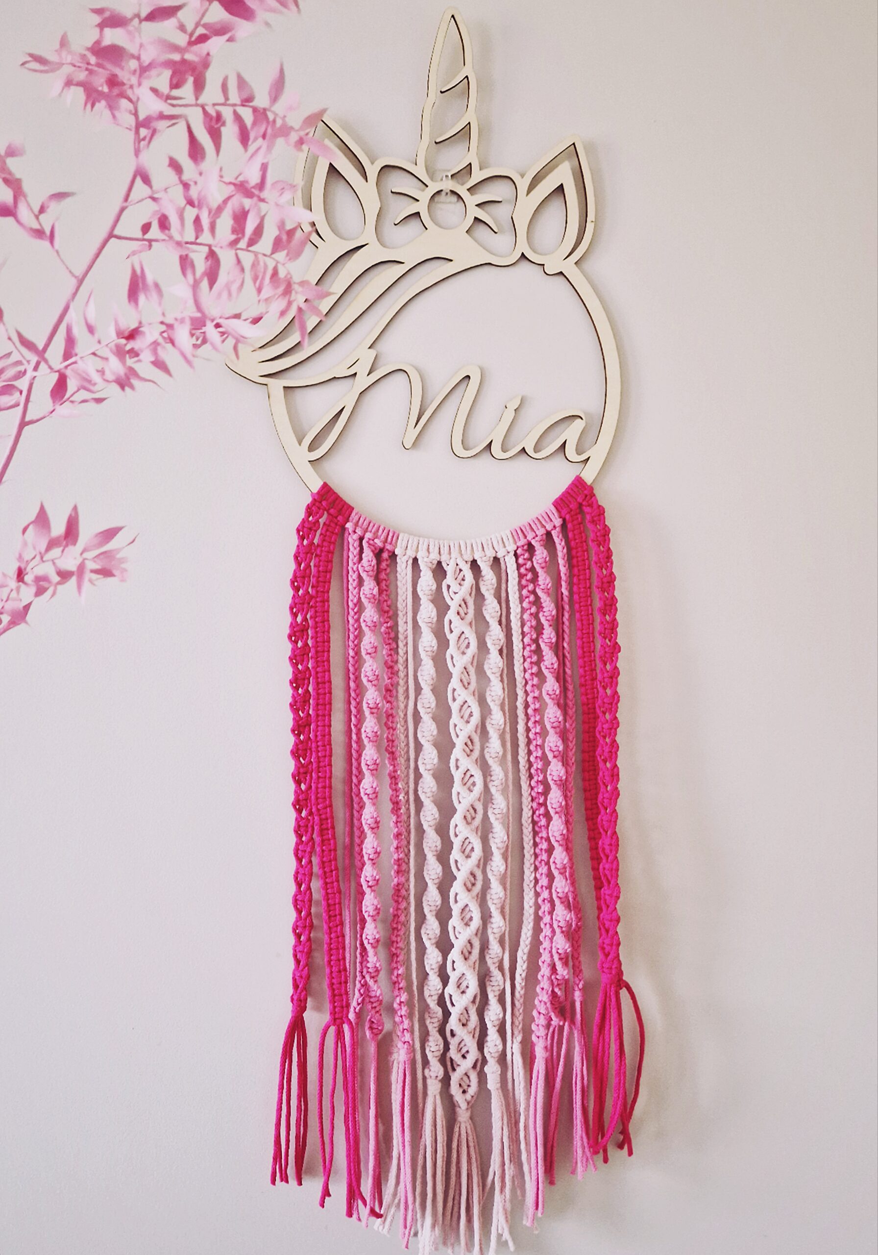 Personalizowana makrama wykonana na obręczy w kształcie jednorożca. Jej wymiary to około 33 x 100 cm.