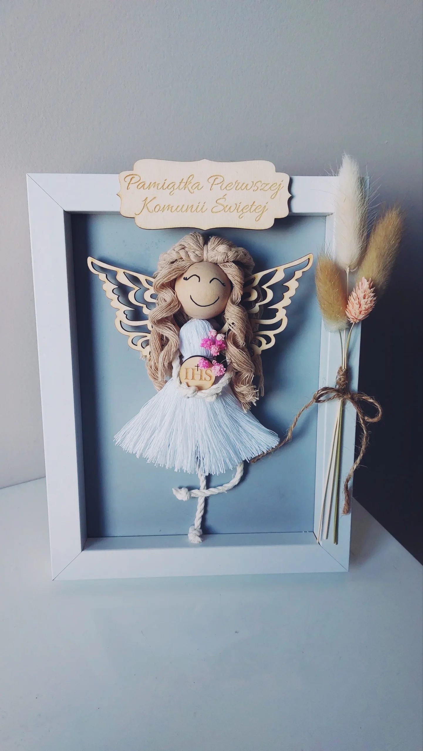 W komentarzu do zamówienia należy podać tekst na tabliczkę główną, czy anioł ma trzymać koło IHS czy serduszko z imieniem (podać imię), kolor włosów (beżowy, blond, brąz lub czarny), kolor ramki (biała lub drewno) oraz preferowany kolor suszków.