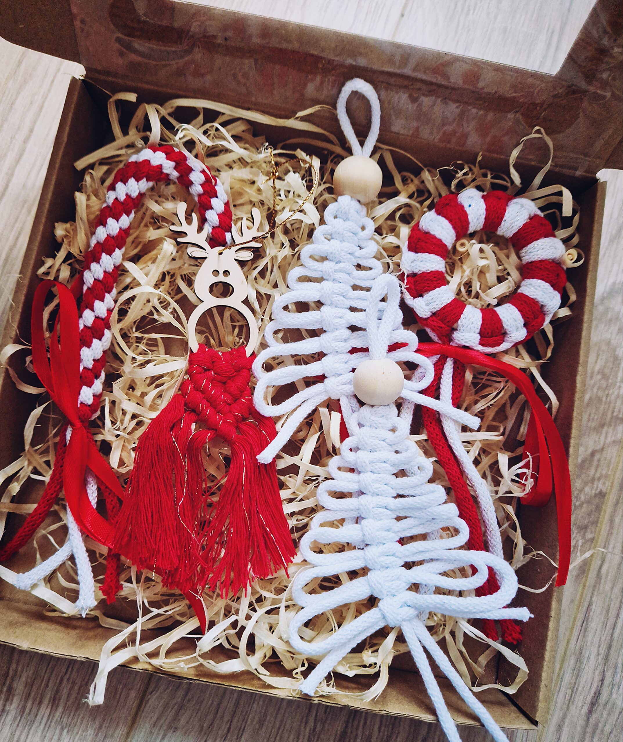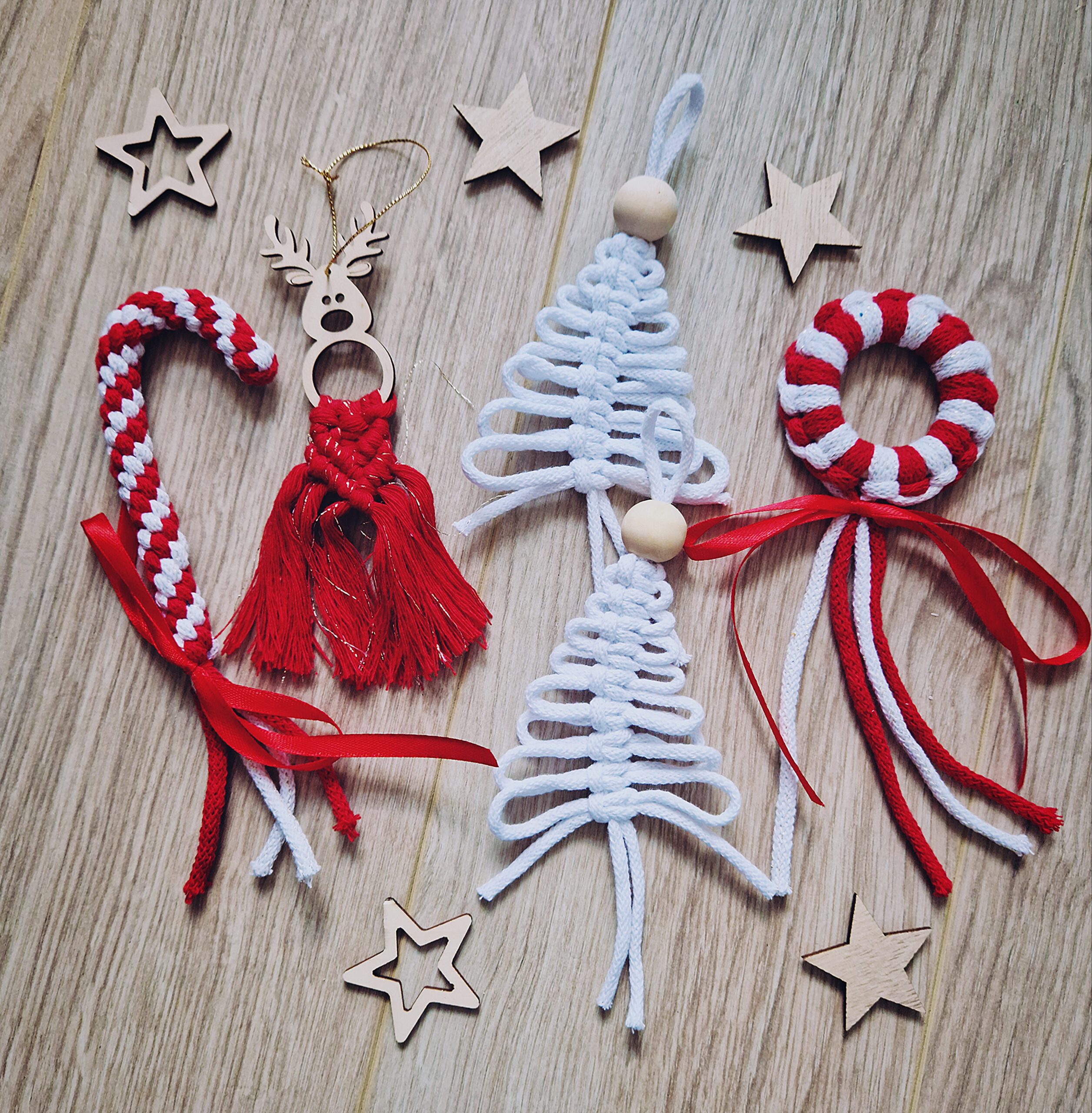 Ozdoby ze zdjęcia są w kolorze czerwonym i białym.